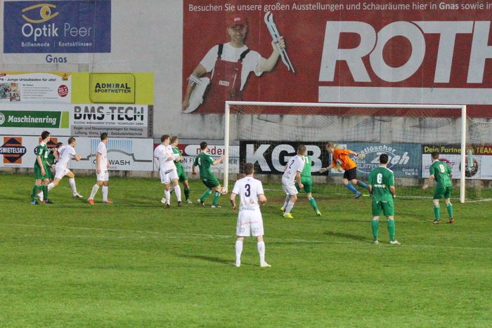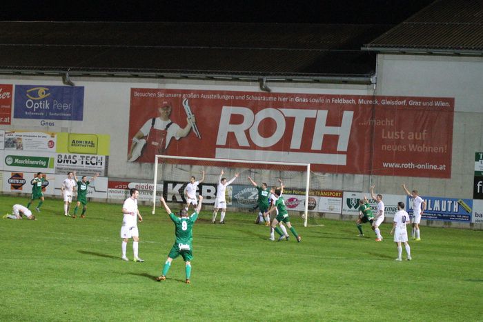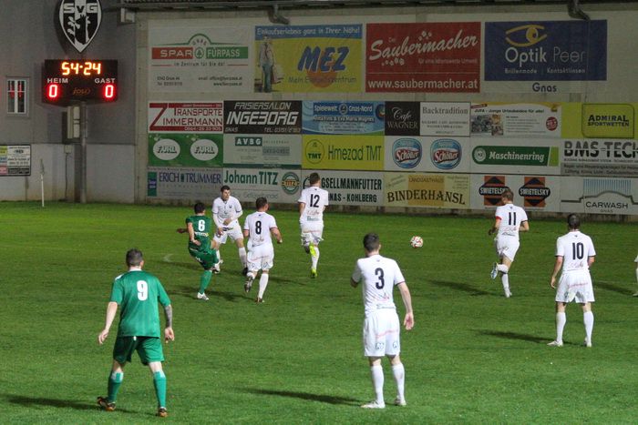 In der 32. Minute kam der Gnaser Angreifer Raphael Knewallner auf der linken Seite durch und zog ab, der Ball ging am langen Eck vorbei ins Torout. Nach einem langen Ball auf Stefan Strohmaier kam Gästetorhüter Bartosch aus dem Tor, verfehlte das Leder, ein Verteidiger sprang helfend ein und konnte bereinigen (42.). In der 43. Minute kamen die Gnaser zu der bis dahin besten Gelegenheit, doch Stefan Klenner köpfelte einen Wohlmuth-Freistoß knapp an der linken Stange vorbei.