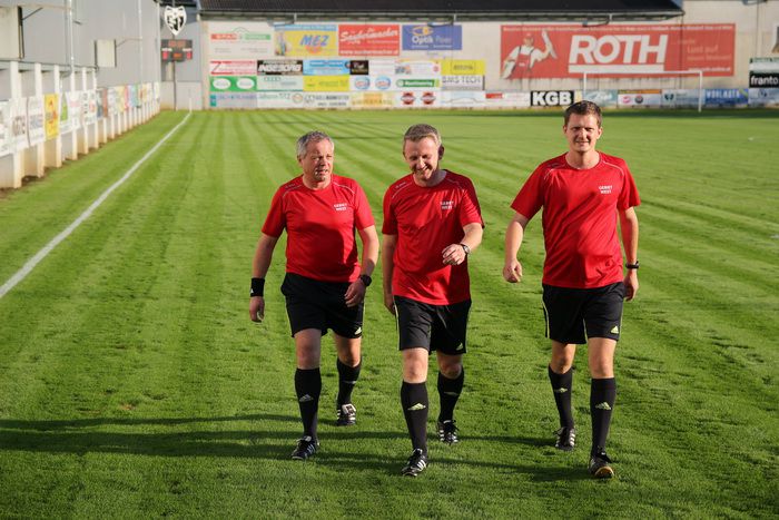 Ein gut gelauntes Schiedsrichterteam, SR Spörk (Mitte), Reinbacher (links) und Kollmann.