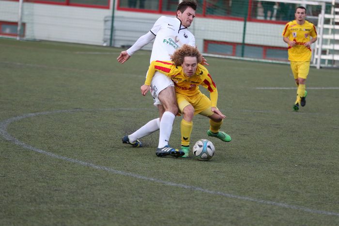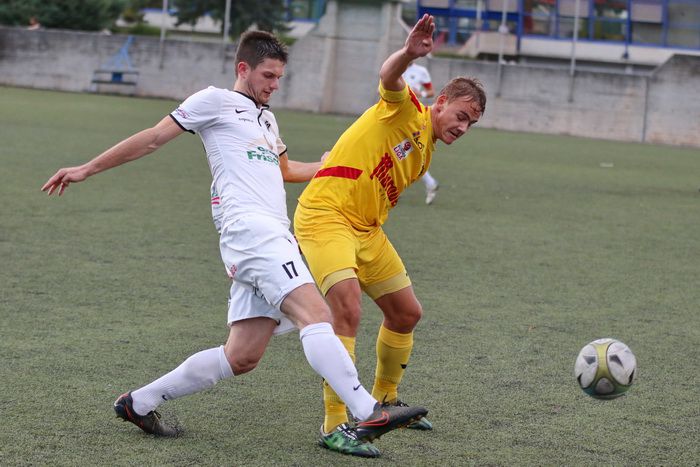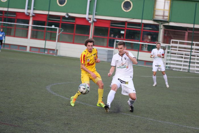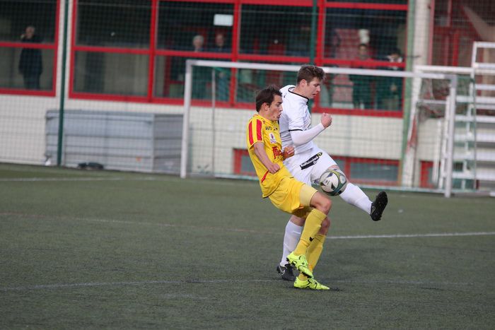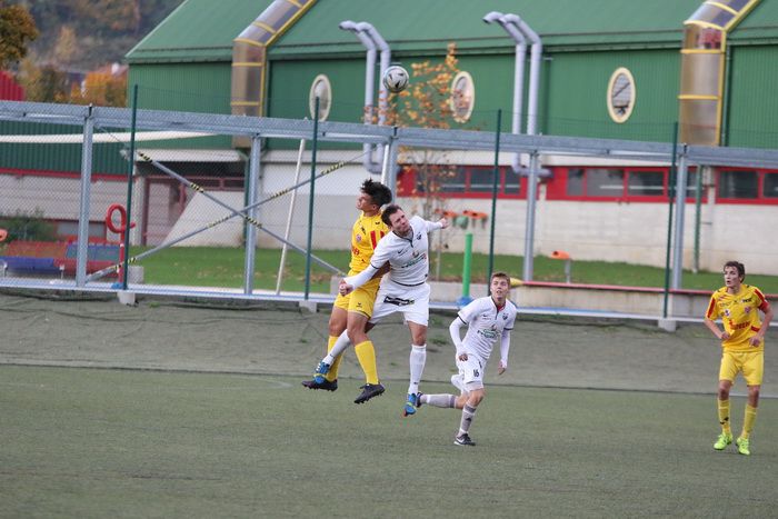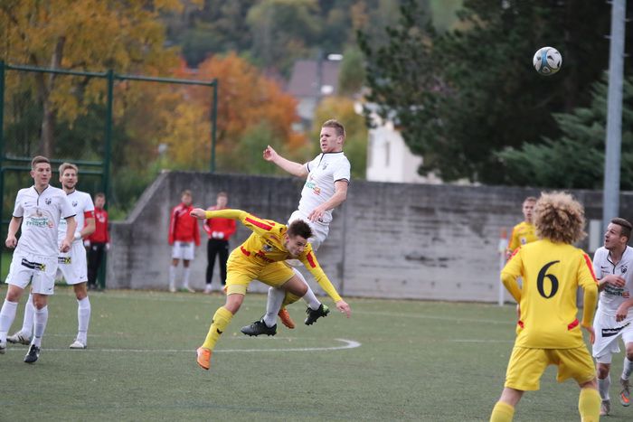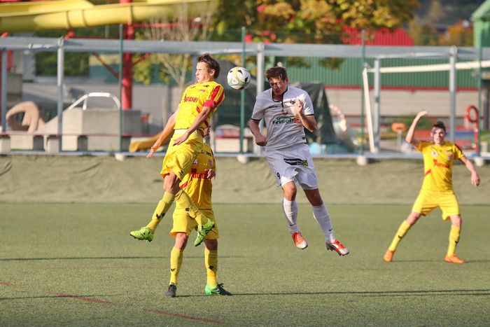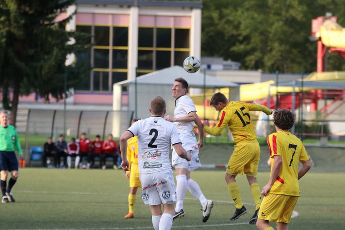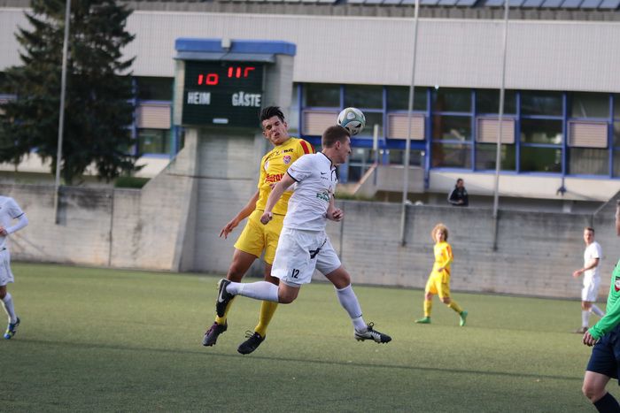 Kopfballduell zwischen Rene Obendrauf und Renato Dilber (Nr.15).