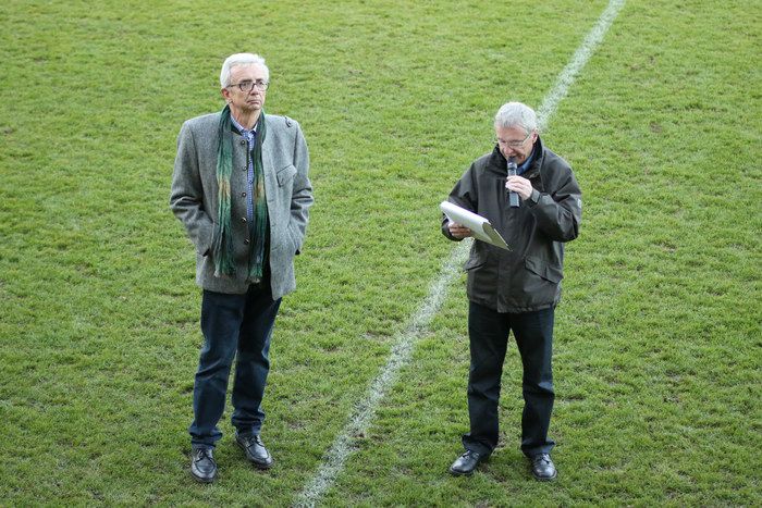Gedenkminute für den verstorbenen Harry Rauch, dem Mister DSV Leoben...Links DSV-Obmann Gröbminger.