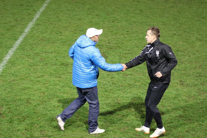 DSV-Trainer Auffinger gratuliert Gnas-Trainer Kovacevic.