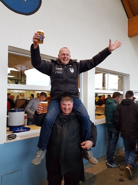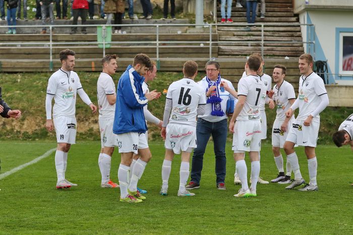 Gnas-Präsident Rudi Schwarz wird nach dem Spiel von Günter Niederl geschultert.