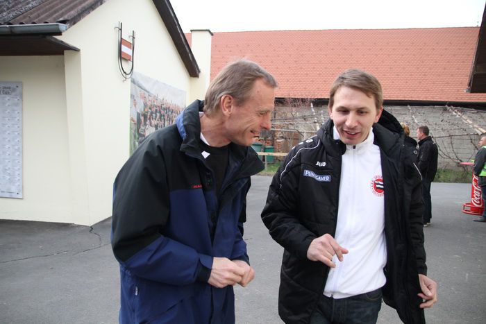 Der heutige Platzsprecher und Sportkoordinator Mag. Leo Suppan im Gespräch mit Voitsberg-Sektionsleiter Heimo Blümel.