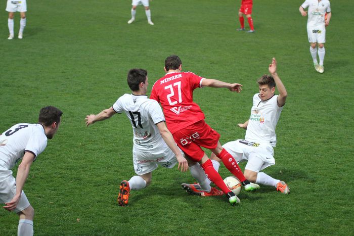 Maxi Opferkuch (in der Mitte) rutscht bei einem Strohmaier-Stanglpass von rechts vorbei (68.).