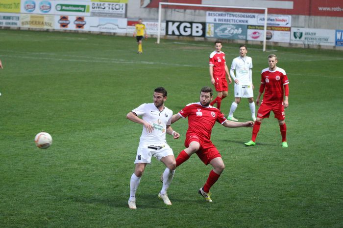 Roth ist schneller am Ball als Voitsberg-Kapitän Jürgen Hiden. Pausenstand 1:0.