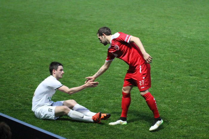 Martin Hiden entschuldigt sich für ein Foul bei Christian Schadler.