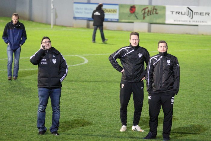 Bange Blicke nach einem Flutlichtausfall in der Pause. Sportlicher Leiter Andy Zach und die Gnaser Trainer.