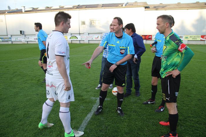 Gnas-Kapitän Matthias Schadler und Gleisdorf-Kapitän Markus Deutschmann mit SR Klaus Strasser bei der Platzwahl.