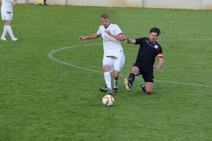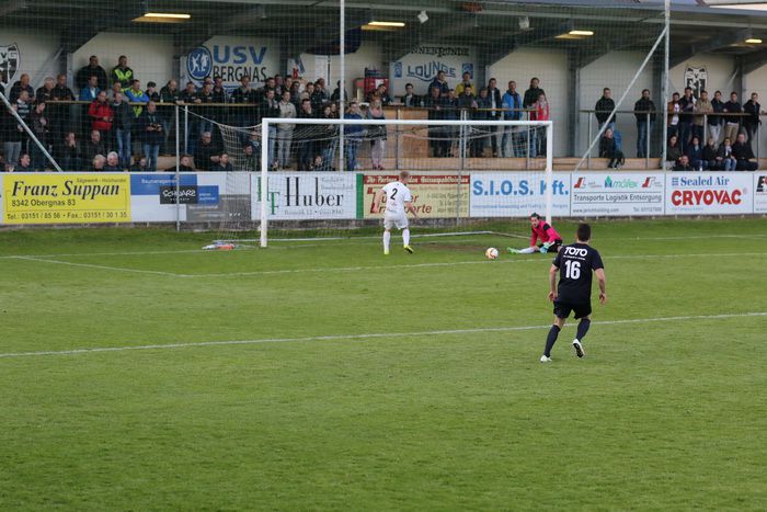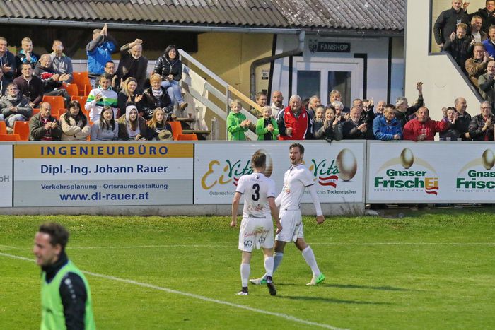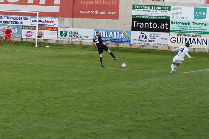 Mit der ersten Möglichkeit der Gäste stand es aber, entgegen dem Spielverlauf, plötzlich 0:1. Alexander Adelmann lief allein aufs Tor von Roth, setzte sich im Strafraum im Duell gegen Zimmermann mit einem Hacken durch und schob das Leder an Goalie Roth vorbei ins linke Eck. Das war in der 26. Minute. Zwei Minuten darauf versuchte Kapitän Christoph Trippl aus 8 m nachzusetzen, scheiterte aber an der Reflex-Fußabwehr von Gnas-Goalie Alexander Roth. Die Mannschaft um Kapitän Christoph Haas war aber weiterhin die spielerisch bessere Mannschaft. In der 35. Minute wurde Matthias Schadler im Strafraum gefoult, den dafür diktierten Strafstoß verwandelte Daniel Haas sicher und unhaltbar für Keeper Admir Peckovic zum 1:1-Ausgleich.