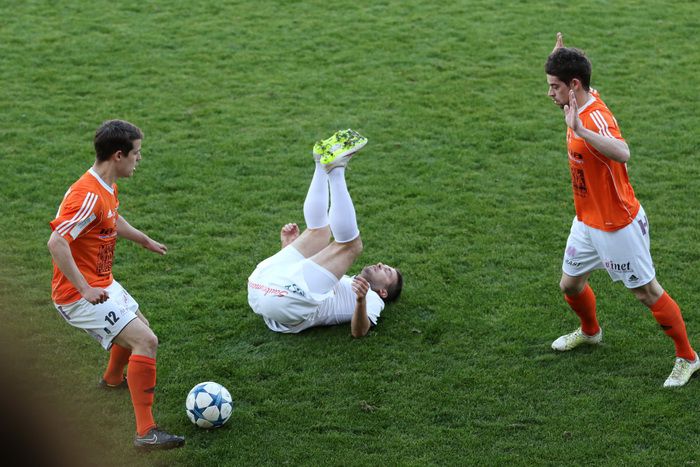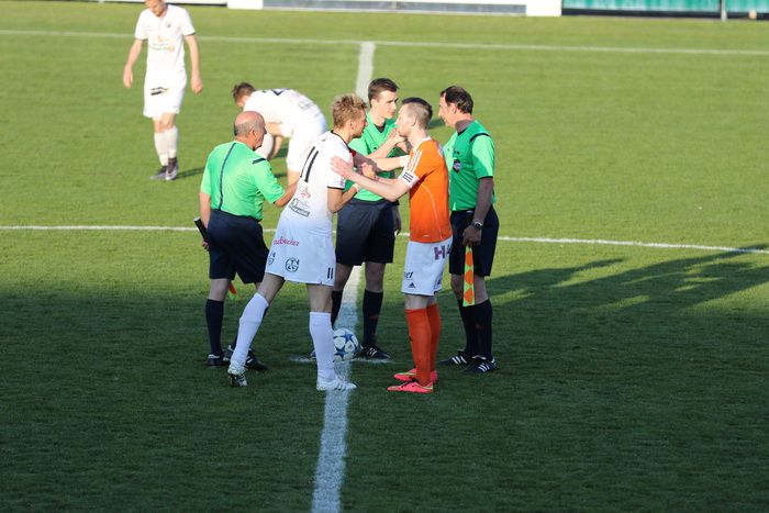 Nach diesem Foul von Stefan Klenner (links) zieht SR Gremsl die gelbe Karte (39.).