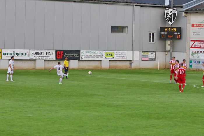 Nach Foul an Kniewallner schießt Matthias Schadler den Freistoß aus rund 22 m....