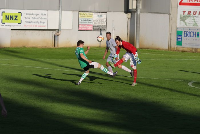Hintereinander klärt Gnas-Goalie Alex Roth vor Michael Vollmann...