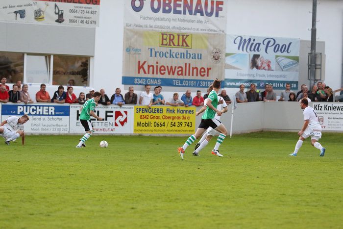 Nach einem Eckball konnte Roth einen Schuss von DSV-Kapitän Füzfa halten (30.). Auf der anderen Seite vergaben die Gnaser nach schönem Spielzug durch Rene Obendrauf, der das Leder aus 18 m über die Querlatte knallte (31.). Es ging ständig hin- und her. Bei einem Partl-Schuss aus 20 m war Gnas-Keeper Alex Roth auf dem Posten (36.). In der Schlussphase der ersten Halbzeit kamen die Gnaser zu zwei Halbchancen. Ein Christian Schadler-Schuss wurde zur Ecke abgefälscht und nach einem C. Haas-Freistoß aus der eigenen Hälfte kam Rene Obendrauf zum Kopfball. Goalie Nömayer war zur Stelle.