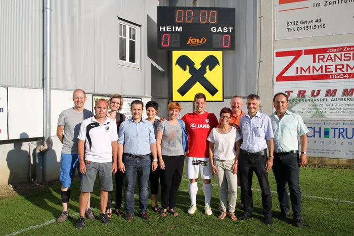 Das Team des Sponsors, Raiffeisenbank Feldbach-Gnas-Bad Gleichenberg mit Dir. Lafer (2.v.re) vor dem neuen Raiffeisenbank-Logo unter der Anzeigetafel im Gnaser Stadion.
