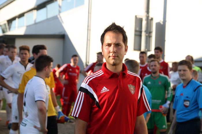 Das Spiel ist aus, Gnas-Trainer Marko Kovacevic tröstet seine Spieler....