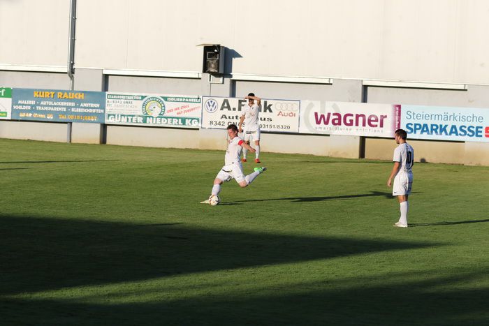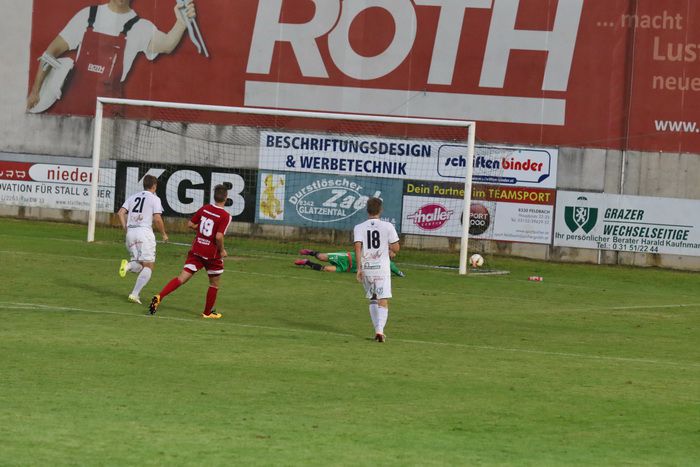 In der 17. Minute bediente Sandro Schleich auf der linken Seite den Gleichenberger Neuzugang Philipp Wendler. Der Ex-Kapfenberger zog in den Strafraum und wurde von Stefan Klenner zu Fall gebracht. Schiedsrichter Christian Birnstingl zeigte sofort auf den Elferpunkt. Diese Chance ließ sich Jürgen Trummer nicht entgegehen und versenkte die Kugel zum 1:0 im linken Eck (18.).