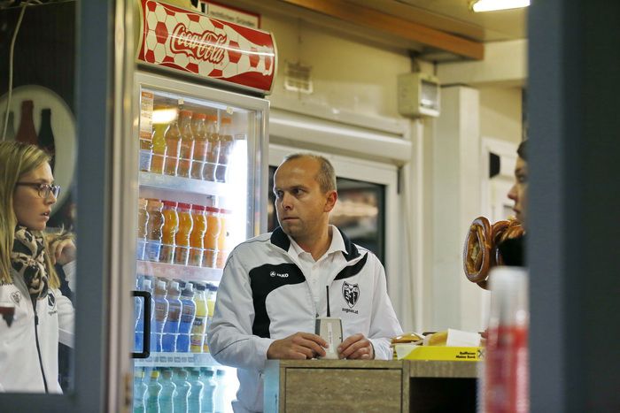 SVG-Kassier Bernhard Fritz bei der Bierschank auf der Stehplatztribüne.