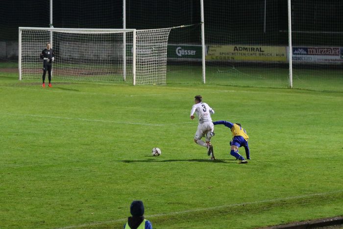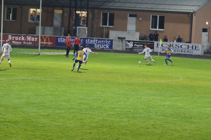 Das Spiel war in der ersten Halbzeit eher ausgeglichen, gute Tormöglichkeiten sahen die rund 200 Fans auf den Rängen des Stadions im ersten Spielabschnitt wenig und die sind bald aufgezählt. Nach einer Matthias Schadler-Flanke von der rechten Seite war Bruck/M-Torhüter Philipp Gröblinger schneller am Ball als Stefan Klenner (6.). Auf der anderen Seite vergab der Ex-Zeltweger Marc Klicnik die wohl größte Chance im ersten Spielabschnitt. Nach schönem Spielzug stand er vor Torhüter Philip Stocker und schob das Leder links am Tor vorbei (14.).