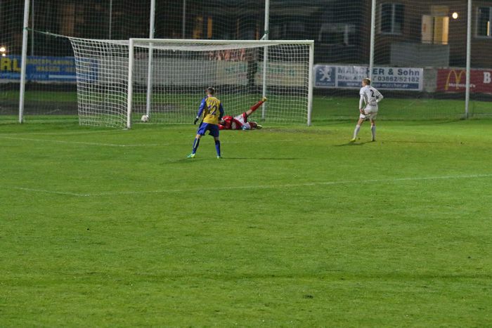 ...schließlich drückt Oliver Fink (Nr. 19) das Leder in die Maschen...