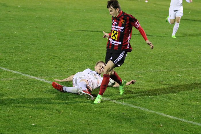 ...Verteidiger Benjamin Eder-Halbedl (links) haut drauf...