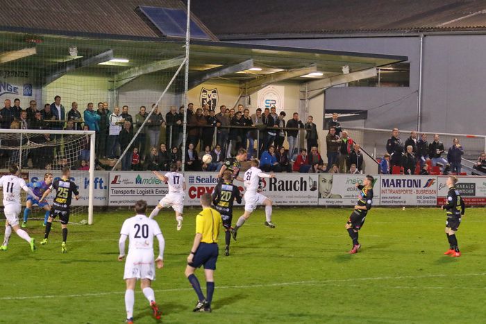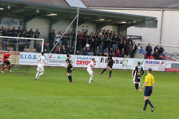 Nach einer Flanke von der linken Seite steigt Michael Waller hoch und köpfelt...
