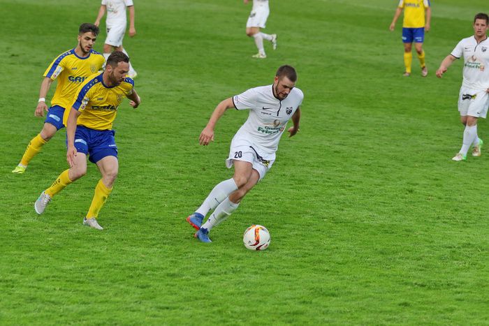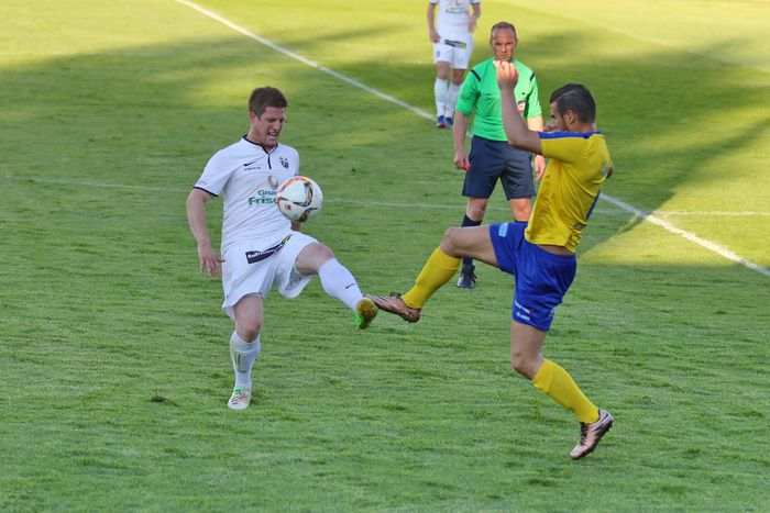 Gestrecktes Bein von Haris Ribic gegen Matthias Schadler. Foulfreistoß für Gnas.