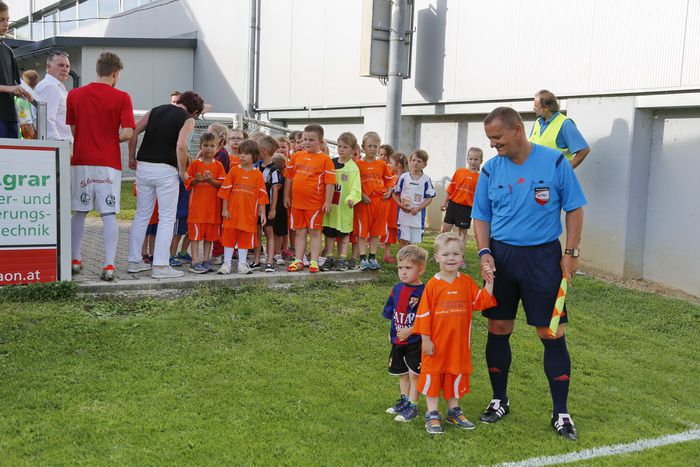 Das Schiedsrichterteam führt die Mannschaften mit Gnaser Kindergartenkinder aufs Feld.