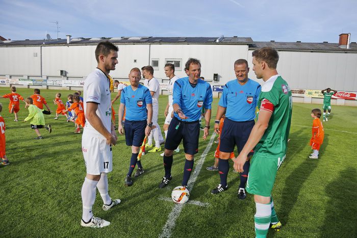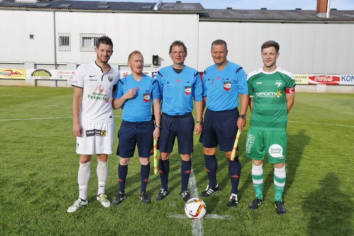 Schiedsrichter Alfred Kislick mit seinen Assistenten Christian Waisssenbacher und Günther Braunstein sowie den Kapitänen Christian Schadler (links) und Erwin Götzenauer.