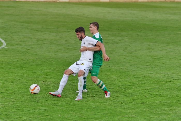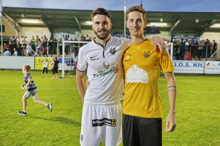 Der künftige Fürstenfeld-Tormann Philip Stocker (rechts) mit Gnas-Stürmer Oliver Fink.