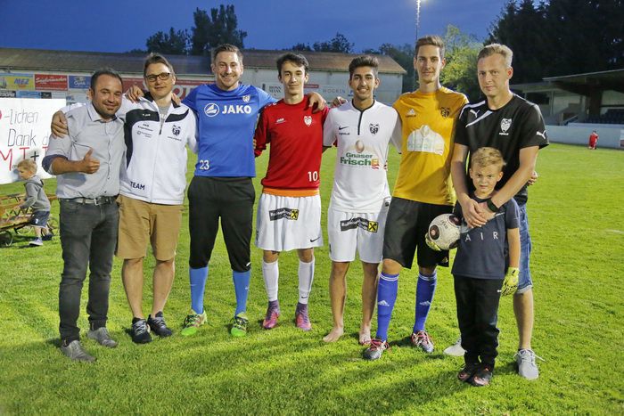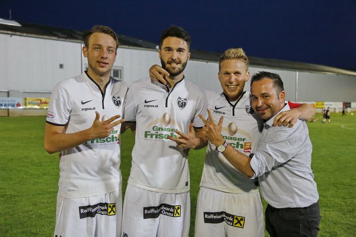 Gnas-Sektionsleiter Marc Trummer freut sich mit den Torschützen David Friedl, Oliver Fink und Stefan Klenner.