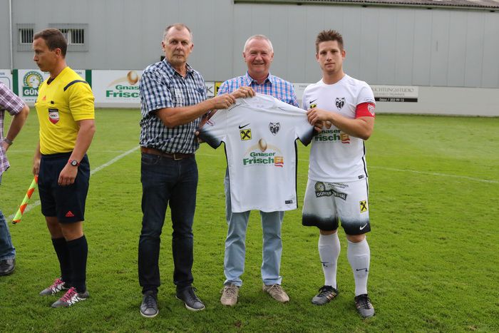 RAIKA-Repräsentant Weninger, Präsident Schwarz und Kapitän M. Schadler präsentieren das neue Gnas-Dress.