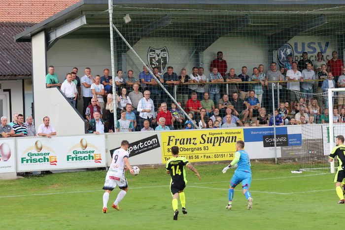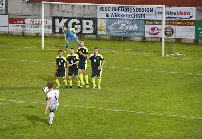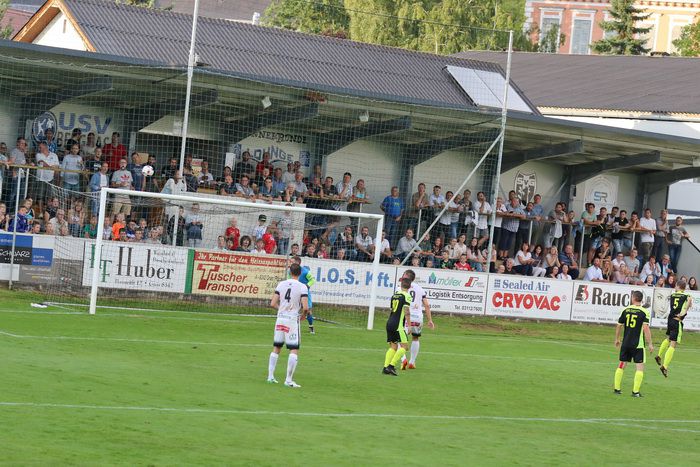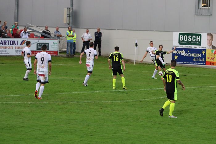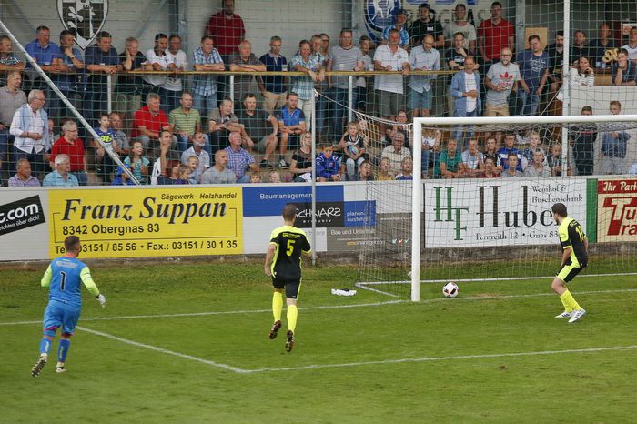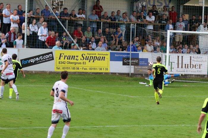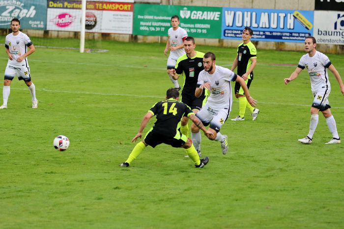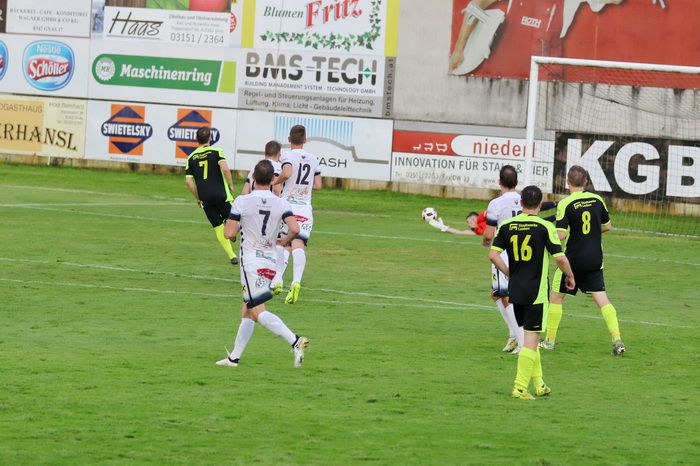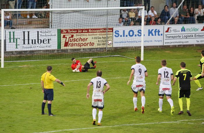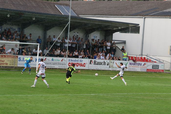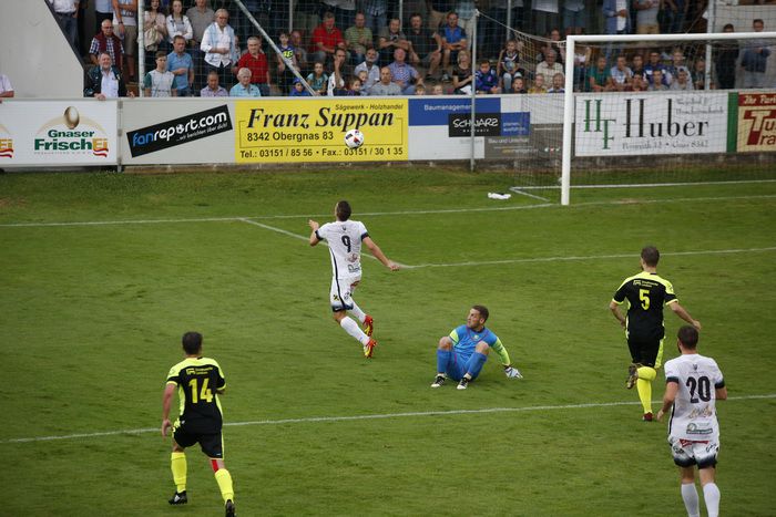 In der 43. Minute versuchte es Mario Giermair mit einem Flachschuss aus 20 m, der Ball zog links am Tor von Ralf Pripfl vorbei ins Torout.