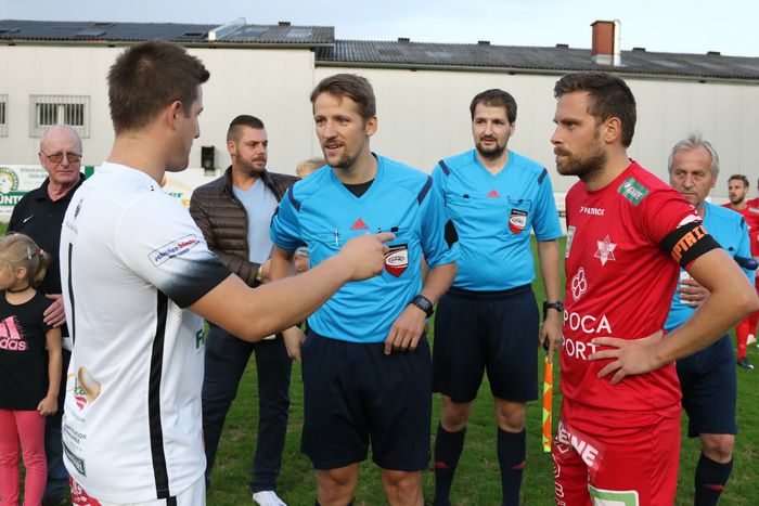 Gnas hat Platzwahl. Kapitän Matthias Schadler zeigt, wo es hingehen soll, rechts GAK-Kapitän Gerald Säumel.