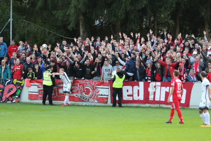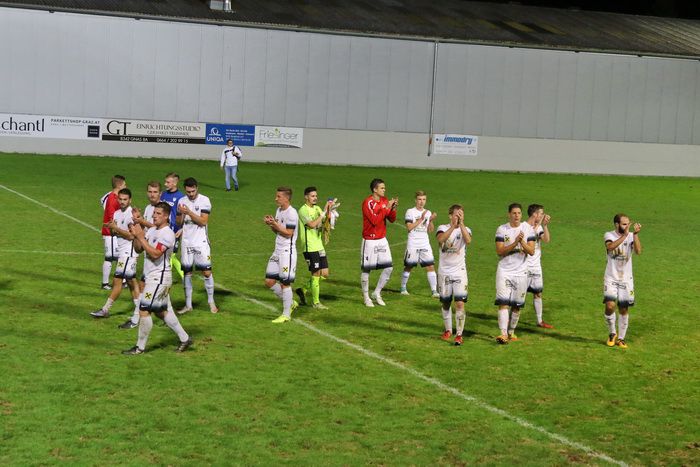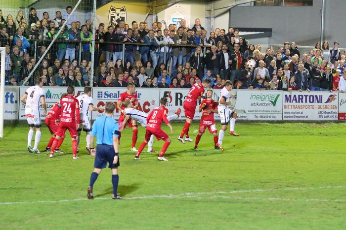 Nach einem Duell zwischen Klenner und einem GAK-Angreifer geht dieser zu Boden, die GAK-Spieler reklamierten Strafstoß, vergeblich.