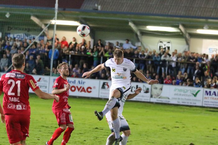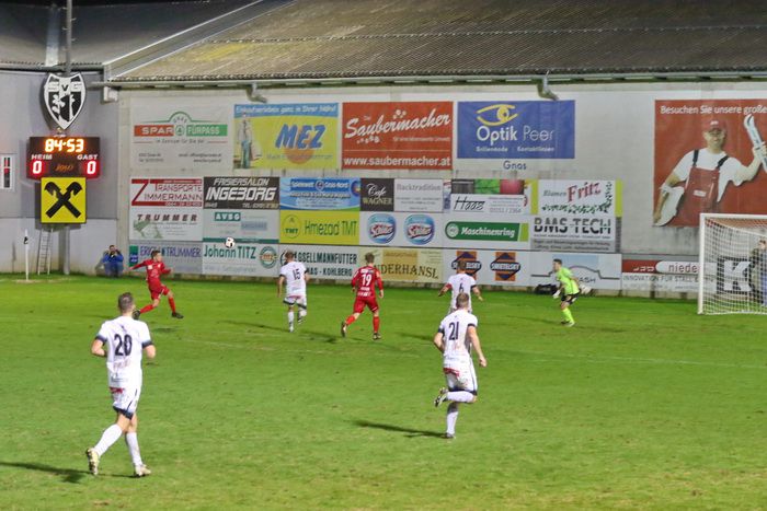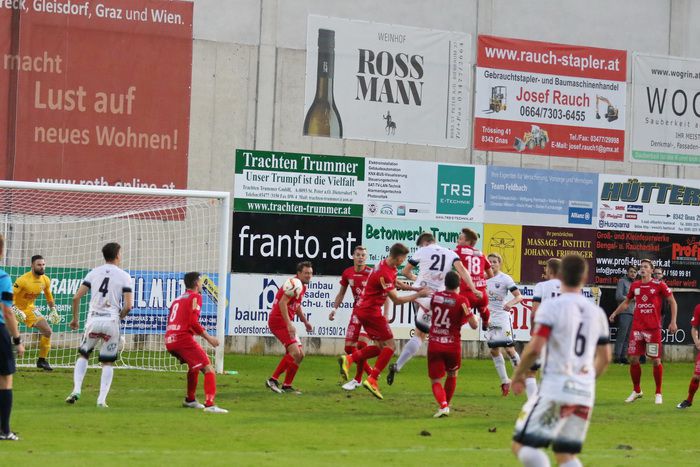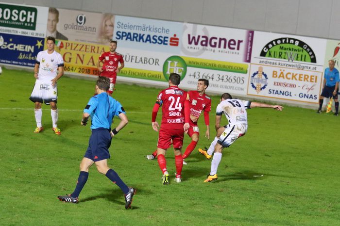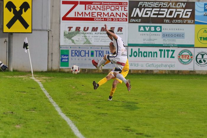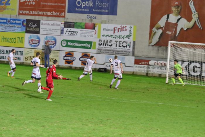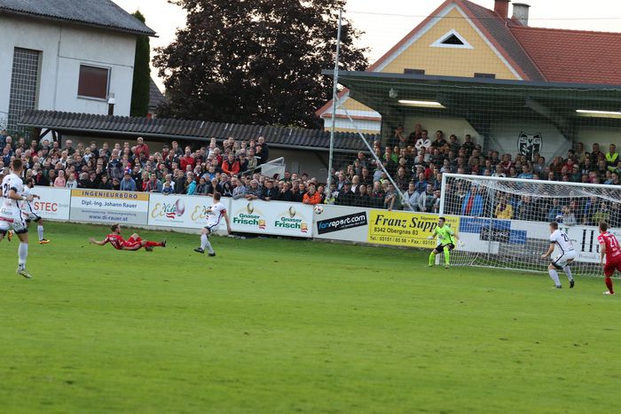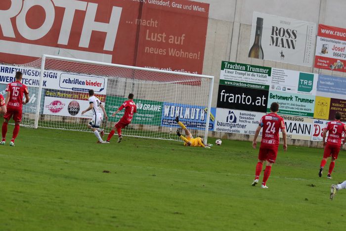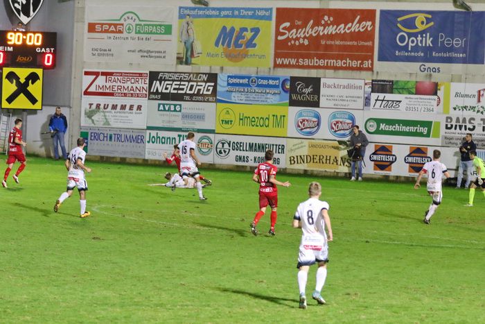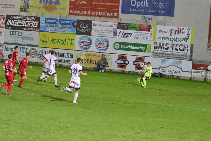 Auf der anderen Seite konnte GAK-Goalie Patrick Haider einen Opferkuch-Schuss halten (8.). In der 16. Minute setzte Maxi Opferkuch nach Angriff über die linke Seite mit schönem Pass Raphael Kniewallner ein. Kniewallner verlängerte den Ball Richtung langes Eck, Tormann Haider konnte das Leder noch aus der Ecke fischen. Einen Eckball von Schadler köpfelte Eder-Halbedl am Tor von Haider vorbei (23.). Ein wuchtiger Distanzschuss von David Fink verfehlte ebenso das Tor der Gäste (35.). Kurz vor der Pause flankte David Fink, über links kommend in den Strafraum, Haider beförderte den Ball über die Querlatte (43.). Pausenstand 0:0.