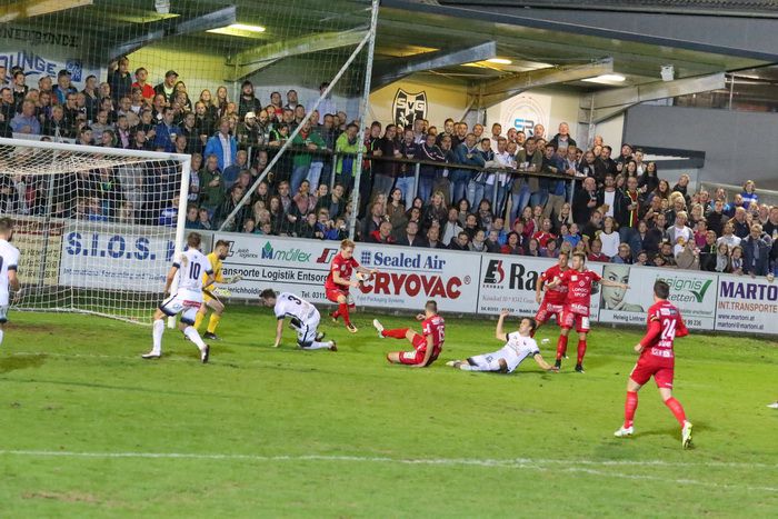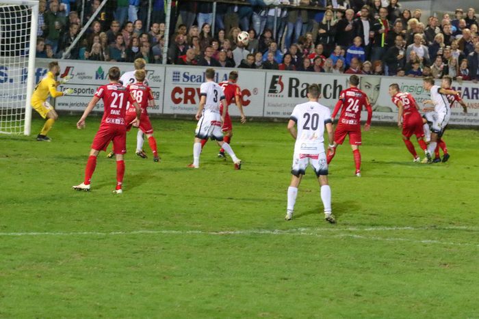 Eine Hereingabe von der linken Seite köpfelt ein GAK-Spieler (am Boden) rechts am Tor vorbei (78.).