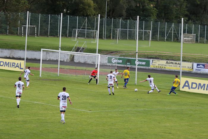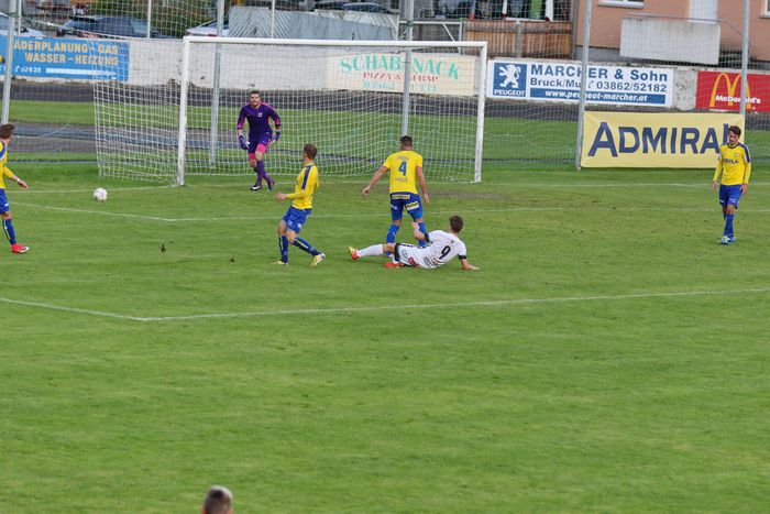 Gelegentlich kamen aber auch die Gnaser in die Nähe von Bruck-Keeper Gröblinger. So in der 26. Minute, als nach Pass von Opferkuch Daniel Luttenberger-Haas bei der Schussabgabe im Strafraum etwas behindert wurde, sodass das Leder links am Tor vorbeiging. Die zweite Riesenchance der Gnaser fand Raphael Kniewallner in der 32. Minute vor. Einen hohen Wohlmuth-Pass nahm Kniewallner an und schoss von der Strafraumgrenze drauf los. Torhüter Gröblinger konnte den Schuss zwar abwehren, doch der Ball lief langsam Richtung Tor. Julian Ertl konnte den Ball gerade noch auf der Torlinie wegschlagen und so den Führungstrefferd der Gnaser verhindern.