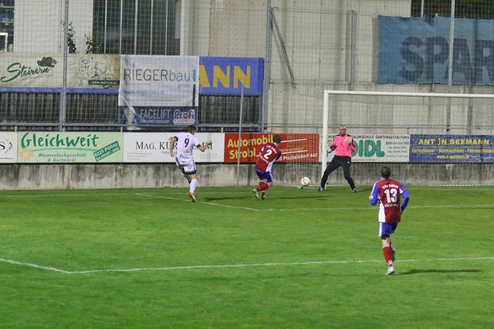 Florian Kernbichler schießt nach einem Konterangriff links am Tor von Gnas-Goalie Ralf Pripfl vorbei (16.).