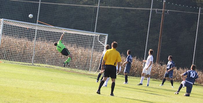 Frannach-Torhüter Harmuss wehrt einen Schuss von Daniel Haas (Nr.9) zur Ecke ab (15.).