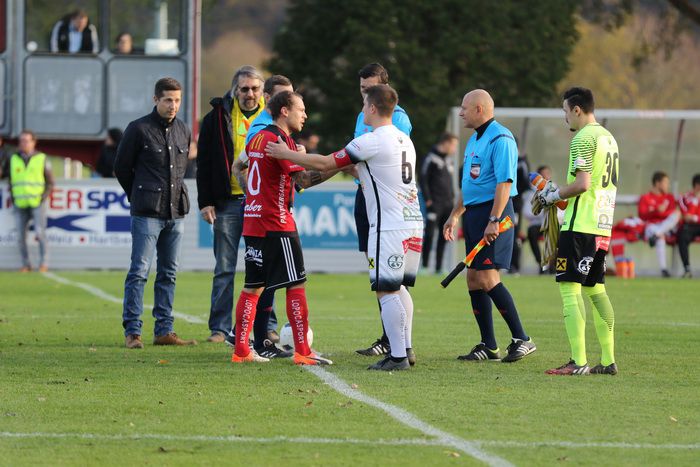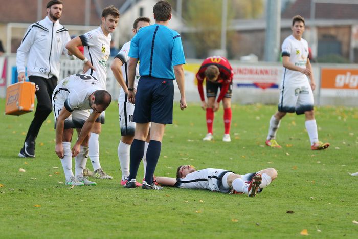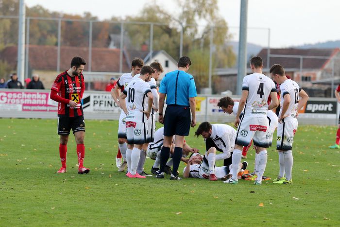 Bei diesem Kopfballduell mit Sascha Bucher verletzt sich Raphael Kniewallner...