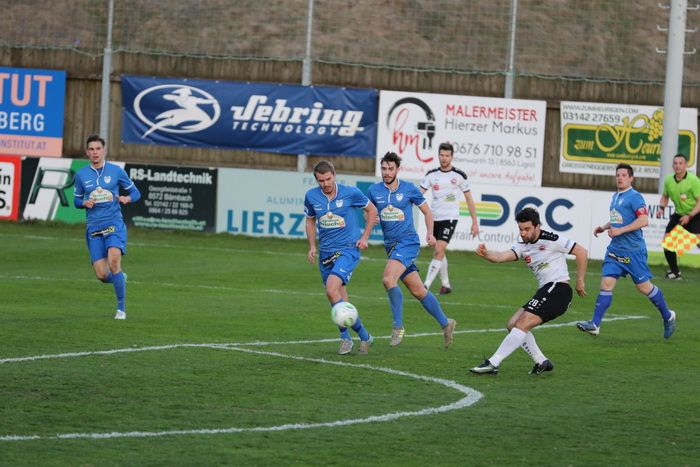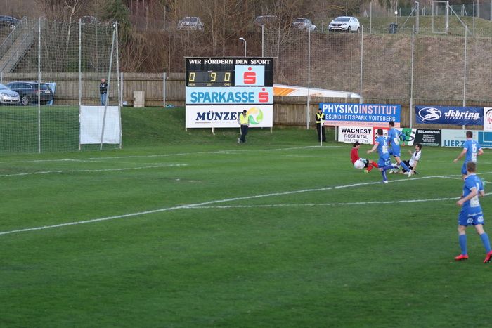 Nach einer Flanke von rechts kommt Michael Grischenig (am Boden) etwas zu spät (43.). Pausenstand 0:0.