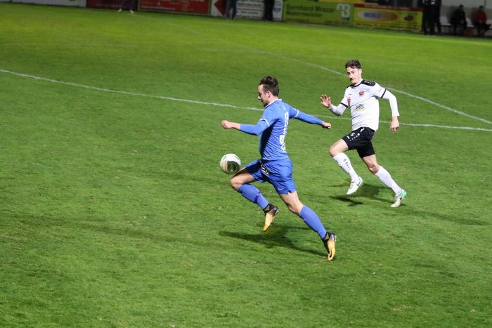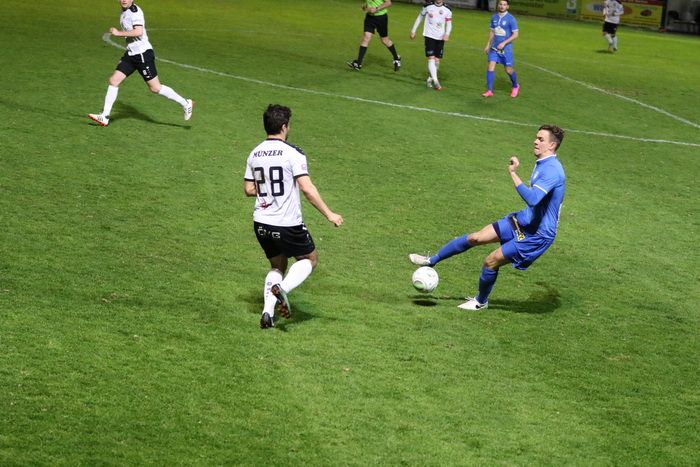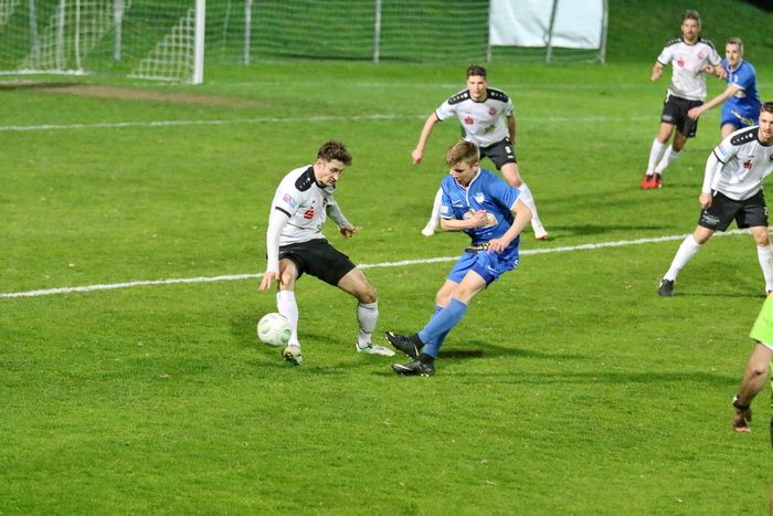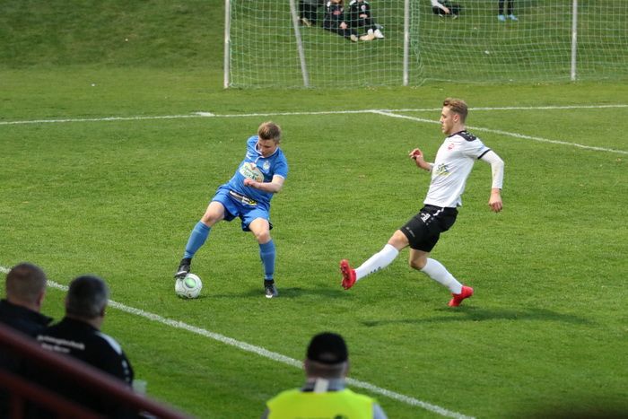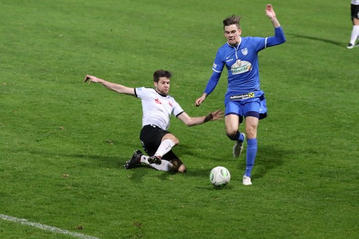 Sven Dodlek schiebt das Leder an Stefan Klenner vorbei.