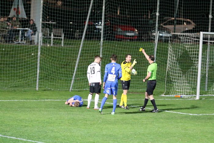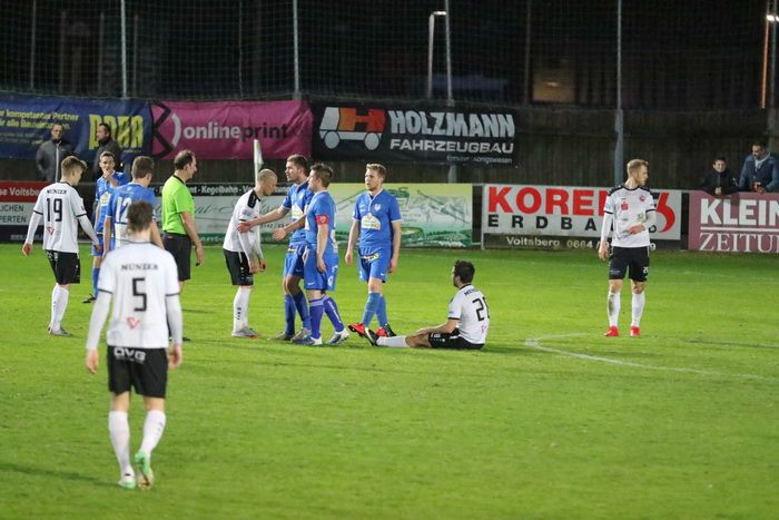 Nach einer Kontoverse zwischen Stefan Klenner (am Boden) und Markus Hiebler sieht der Voitsberger Goalie die gelbe Karte (76.).