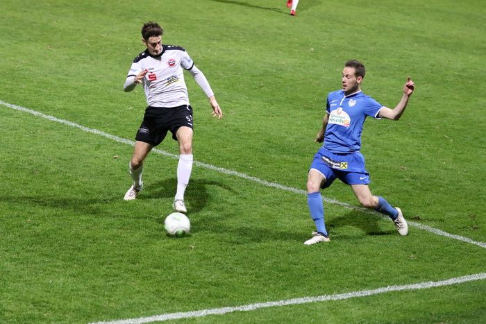 Roth mit Fußabwehr vor Michael Grischenig (9.).