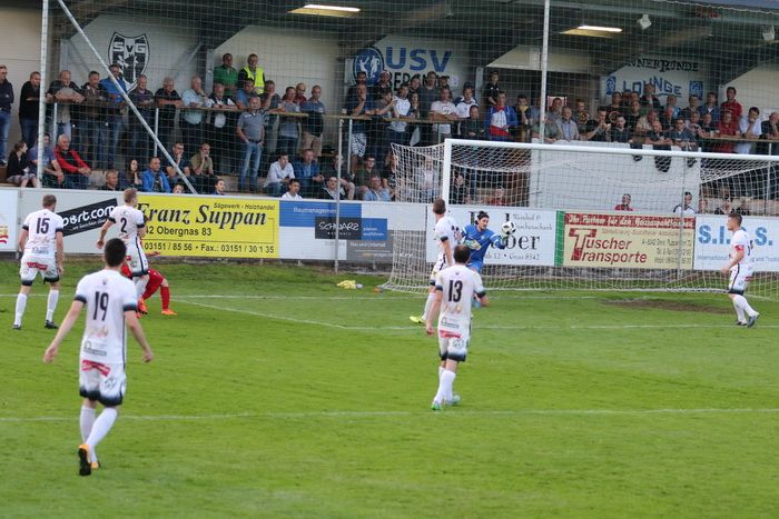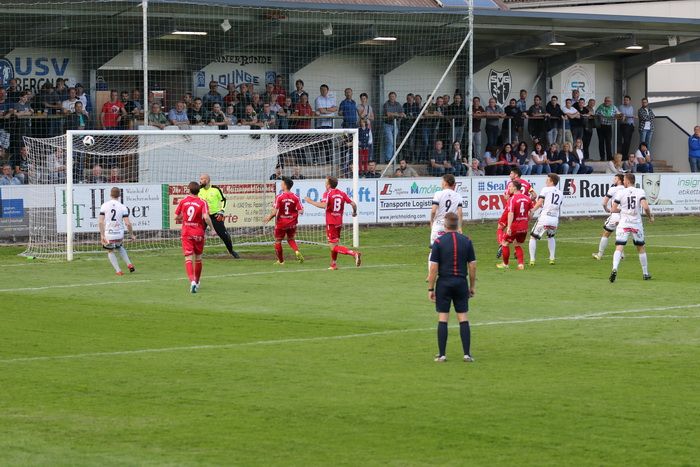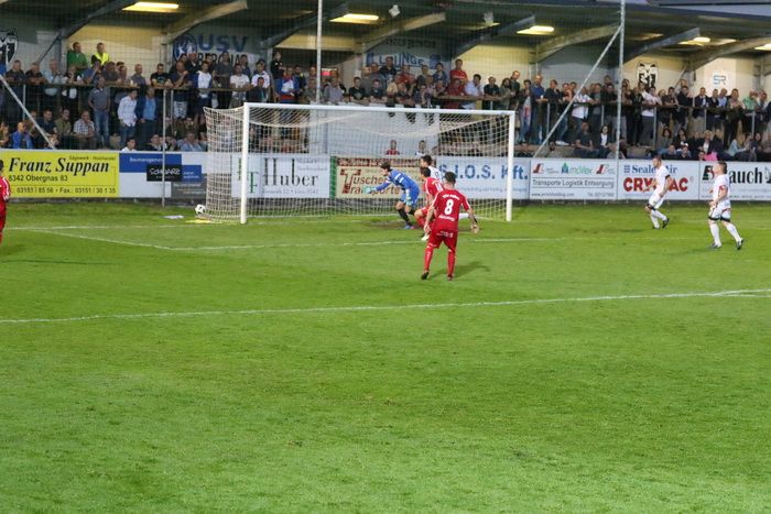 Der Kopfball von Rene Obendrauf (Nr.12) nach Schadler-Freistoß verfehlt knapp das Gästetor (3.).