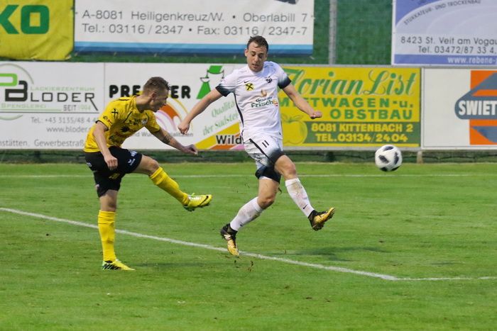 Lukas Ratschnig (rechts) schießt übers Tor von Ralf Pripfl (50.).
