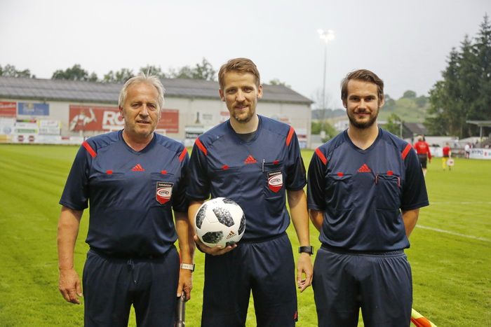 Schiedsrichter Bernd Eigler und seine Assistenten Plank und Schuhajek mit den Teams.