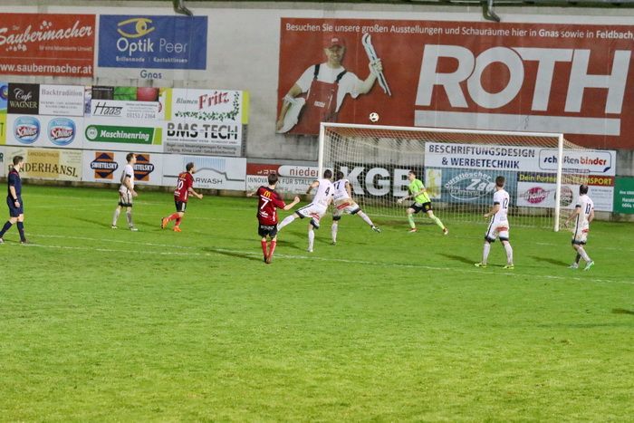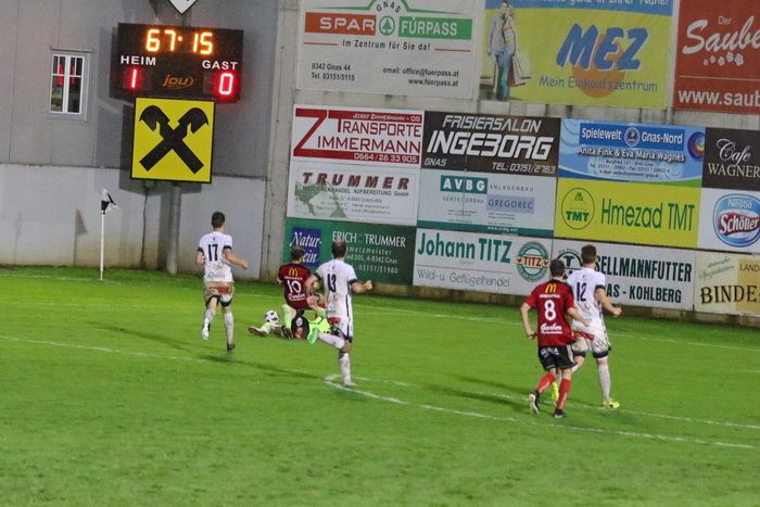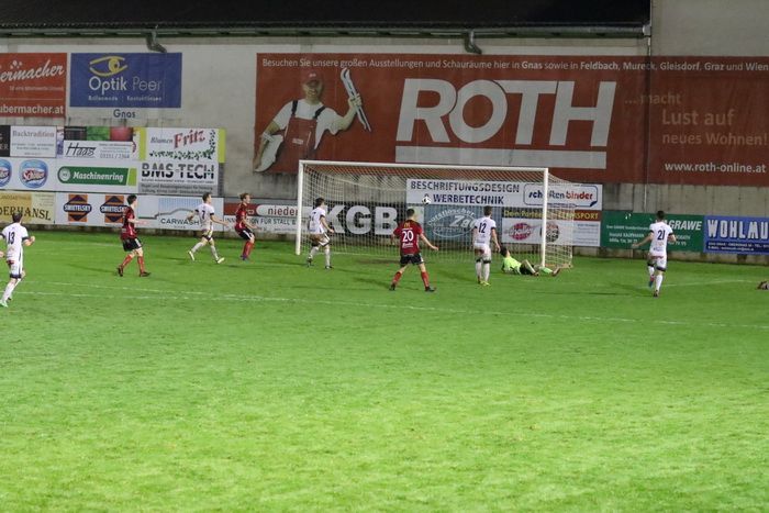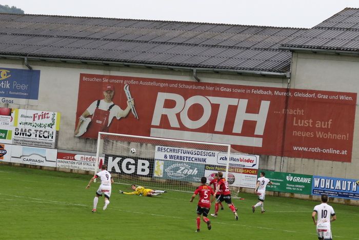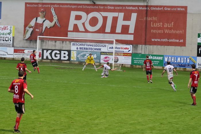 In der 49. Minute konnte Gnas-Goalie Roth den anstürmenden Michael Goger an der Strafraumgrenze noch vom Ball trennen. Den Freistoß hob der Gefoulte selbst in die Mauer.