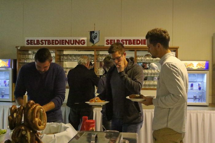 Die verletzten Spieler Matthias Schadler und Stefan Strohmaier stärken sich noch vor dem Spiel mit Backhendl.
