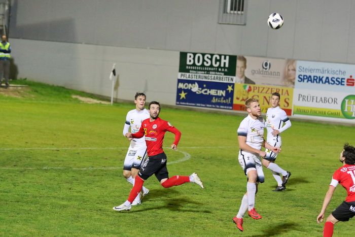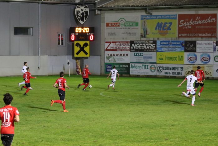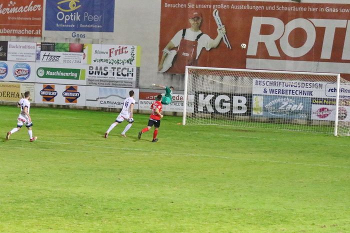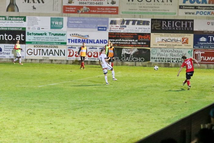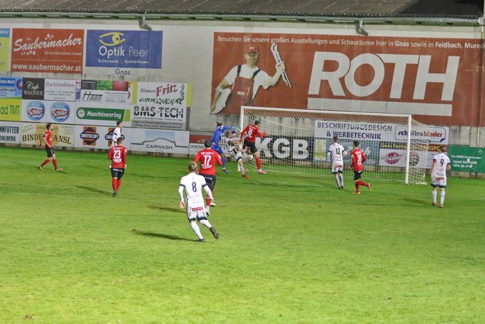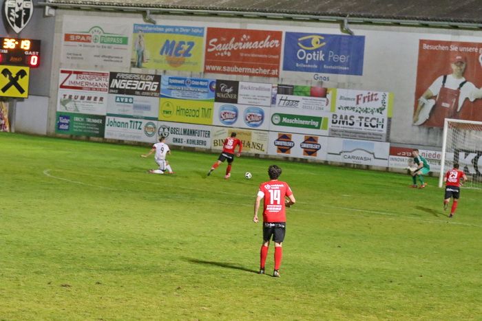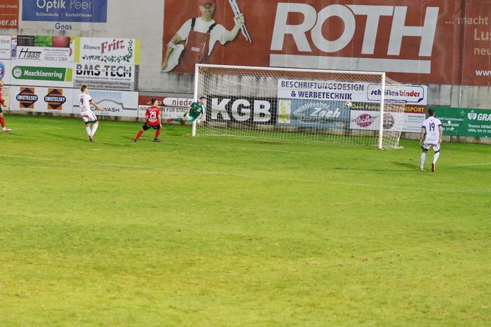 Maxi Opferkuch schloss in der 18. Minute mit einem wuchtigen Schuss aus 20 m ab, Torhüter Daniel Stoiser hechtete den Ball über die Querlatte (18.). Innerhalb von zwei Minuten fand Raphael Kniewallner zwei gute Gelegenheiten vor. Nach einem Vorstoß über die linke Seite zog sein Schuss am langen Eck vorbei (23.). Gleich darauf gab es von Gnas-Torhüter Alex Roth einen weiten Ausschuss. Raphael Kniewallner war schneller am Ball als Torhüter Stoiser, überhob den Tormann, verfehlte aber das Tor.